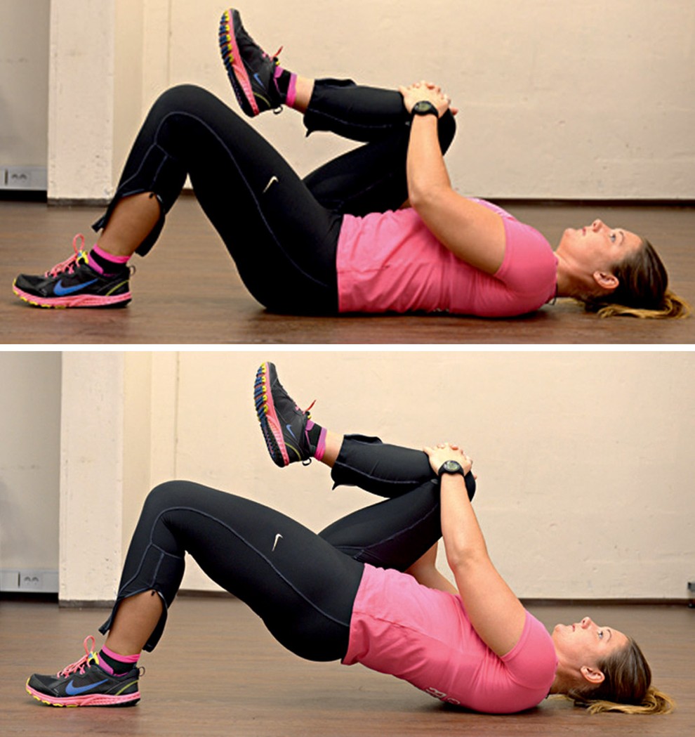 Ležemo na tla in noge pokrčimo, tako da so stopala v stiku s tlemi. Desno nogo pokrčeno povlečemo k sebi in jo objamemo z obema rokama. Iz tega položaja dvignemo medenico in istočasno stisnemo zadnjično mišico in mišice trupa. Zadržimo 5 sekund, potem se vrnemo v začetni položaj.