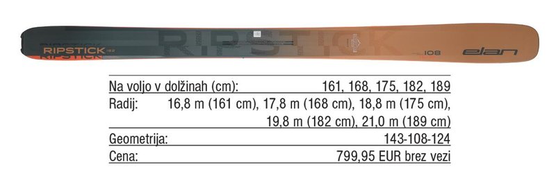 Elan Ripstick 108 je smučka za prosto smučanje, zasnovana za vse, ki iščejo globok sneg, strme linije in zahtevne spuste v gorah. Patentirani profil Amphibio združuje izjemen oprijem robnikov s plovnostjo in okretnostjo, kar omogoča stabilno in odzivno smučanje na vseh podlagah. Tehnologija Carbon Deck s palicami iz ogljikovih vlaken in strateško razporejenimi ojačitvami ustvarja trdno platformo za nadzor pri velikih hitrostih, medtem ko dodatna plast naravnih lanenih vlaken blaži vibracije in izravnava teren pred smučarjem. Ripstick 108 nudi odlično plovnost v pršiču, zanesljiv oprijem na trdi podlagi in lahkotno prehajanje med zavoji, zaradi česar je popolna izbira za prosto smučanje in raziskovanje gorskih terenov. Idealna za smučarje, ki želijo najboljše zmogljivosti v mehkem snegu, stabilnost pri velikih hitrostih in izjemno odzivnost.
