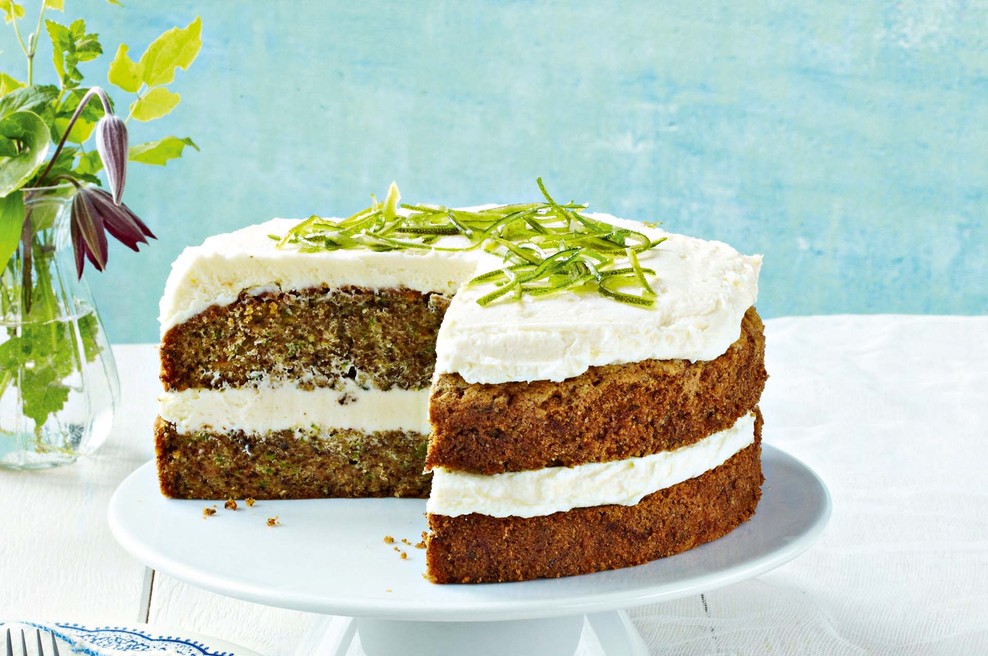 5 Testo vodoravno prerežite. Spodnji del premažite s polovico kreme, jo pokrijte z drugim delom testa in ga premažite s preostalo kremo. Torto za 4 ure postavite v hladilnik. Pred serviranjem jo okrasite z limetino lupinico.
