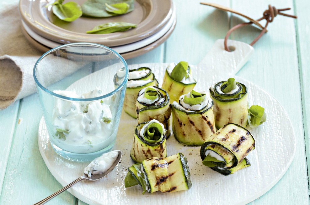 3 Pripravljen nadev razporedite po rezinah bučk in jih zvijte skupaj z listom špinače in bazilike.