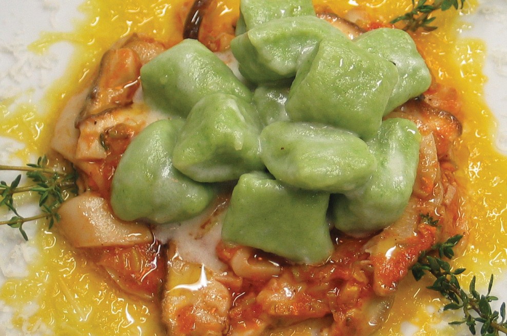 Špinačo za njoke premešamo s parmezanom in jajcem ter s paličnim mešalnikom gladko zmiksamo. Skupaj z obema mokama jo dodamo krompirju ter na hitro vgnetemo v gladko testo. Razdelimo ga na manjše kose in z obema rokama zvaljamo v svaljke debeline 1,5 do 2 cm. Zrežemo enakomerne njoke, jih raztegnemo na pomokanem pladnju in shranimo na hladnem.